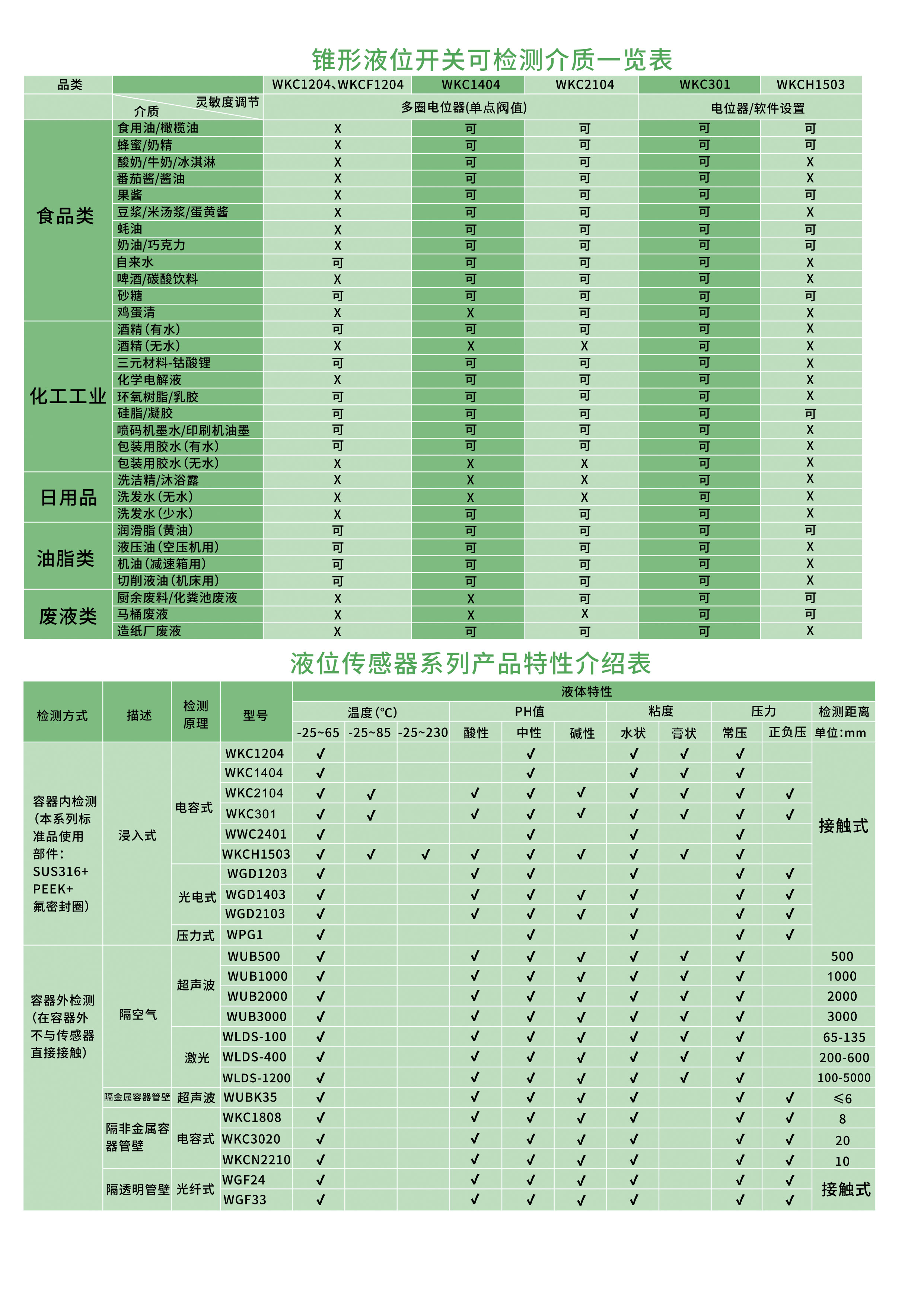 根据您需要的检测液体和使用环境,参考我司产品现有同一行业或类似需求的检测方案作为选型依据。我司传感器检测范围广泛,应用行业:食品行业、化工工业、日化用品行业、油脂类、废液类......