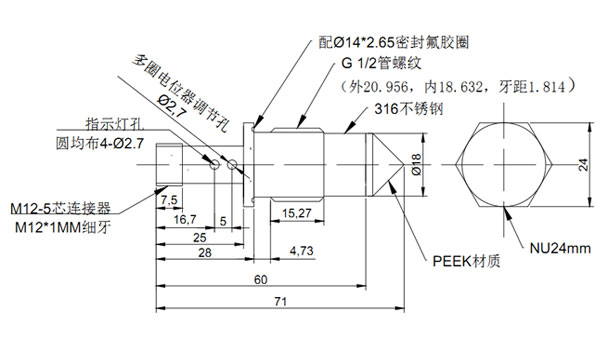 出线方式:M12-5芯防水航空连接器 | LED显示:红色-电源指示、绿色-输出指示 |