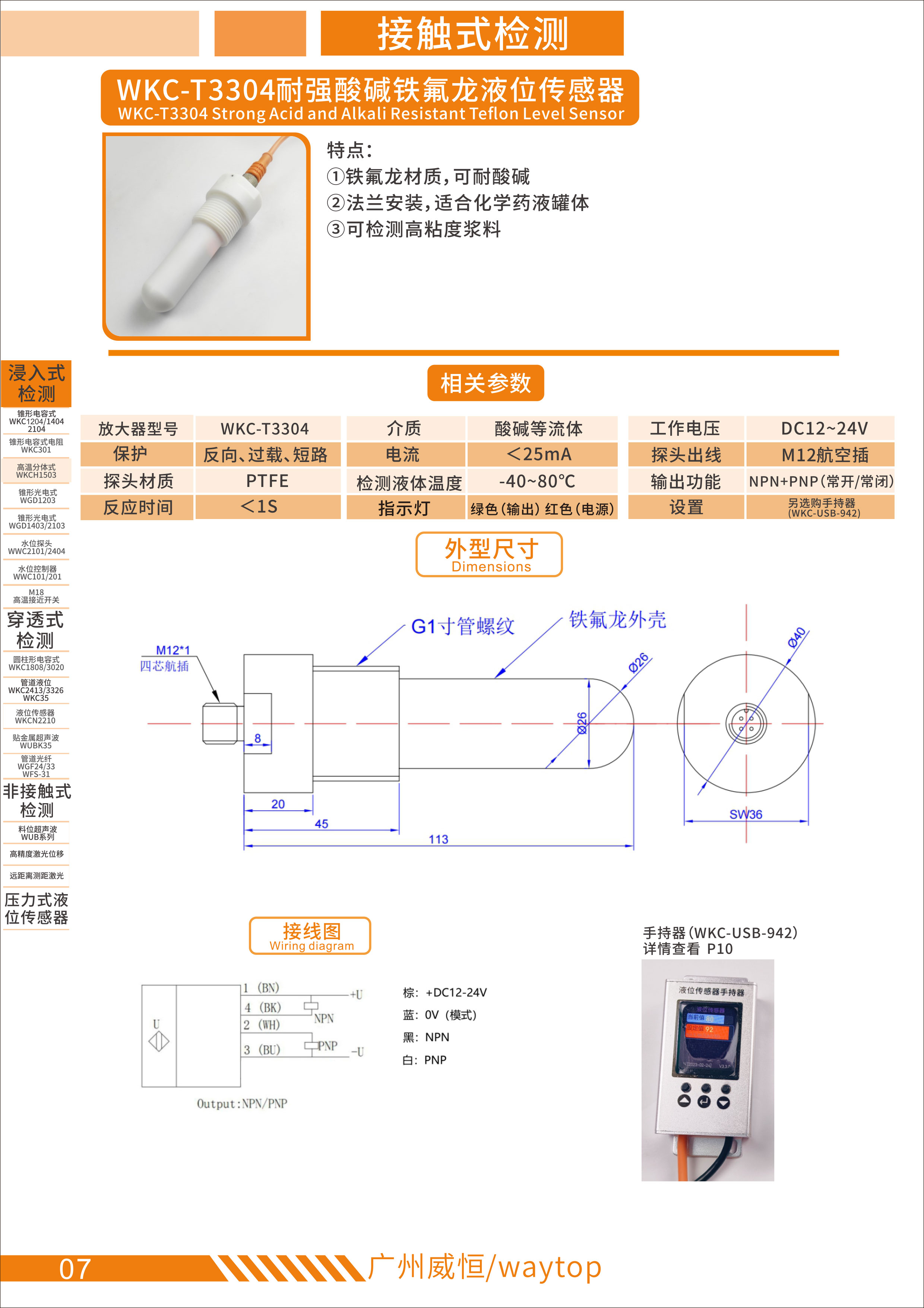 WKC-T3304铁氟龙耐强酸碱液位传感器